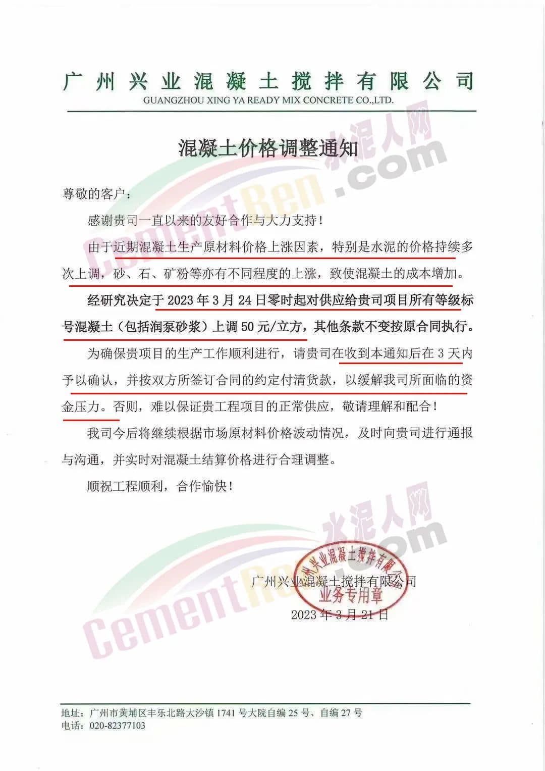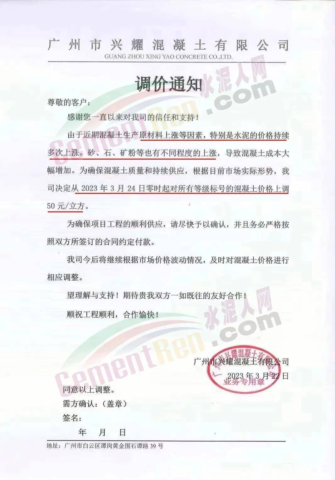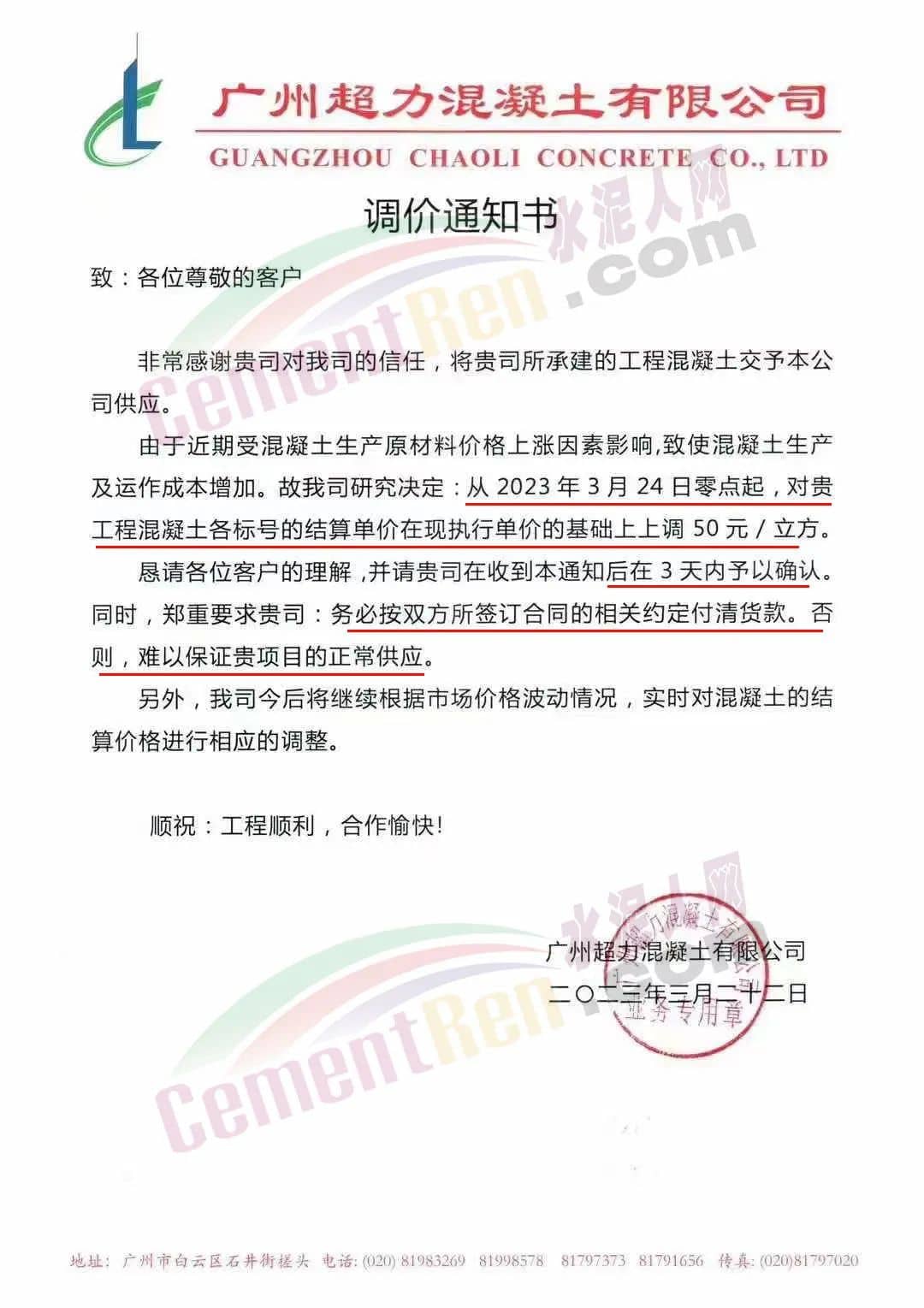 廣州市國豐混凝土有限公司通知由于近期市場原材料砂、石料、水泥價格不同程度上漲的影響,為保證公司正常運(yùn)作,經(jīng)研究決定于2023年3月25日零時起,公司出廠的所有等級標(biāo)號的混凝土在現(xiàn)執(zhí)行價格基礎(chǔ)上再上調(diào)50元/立方。