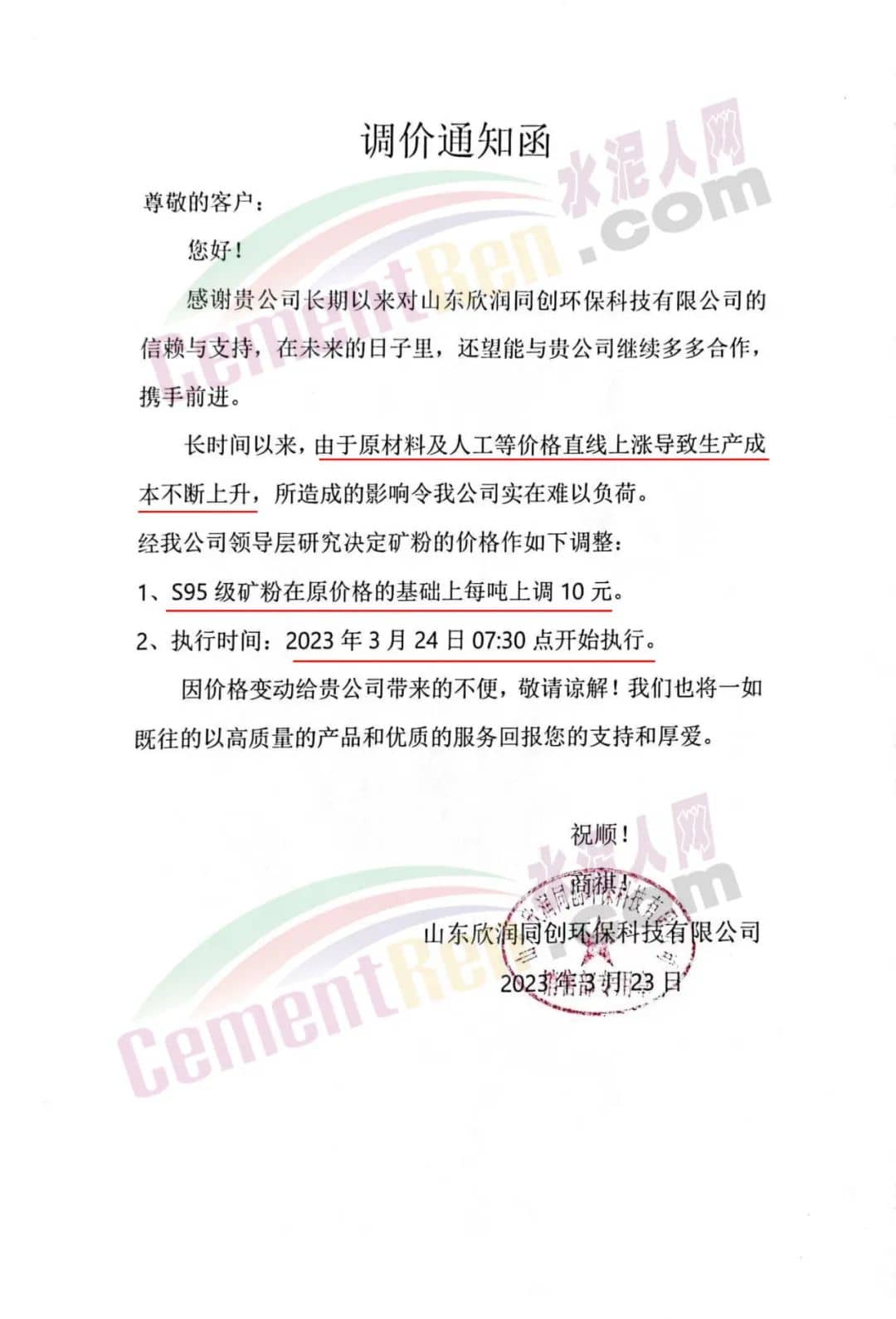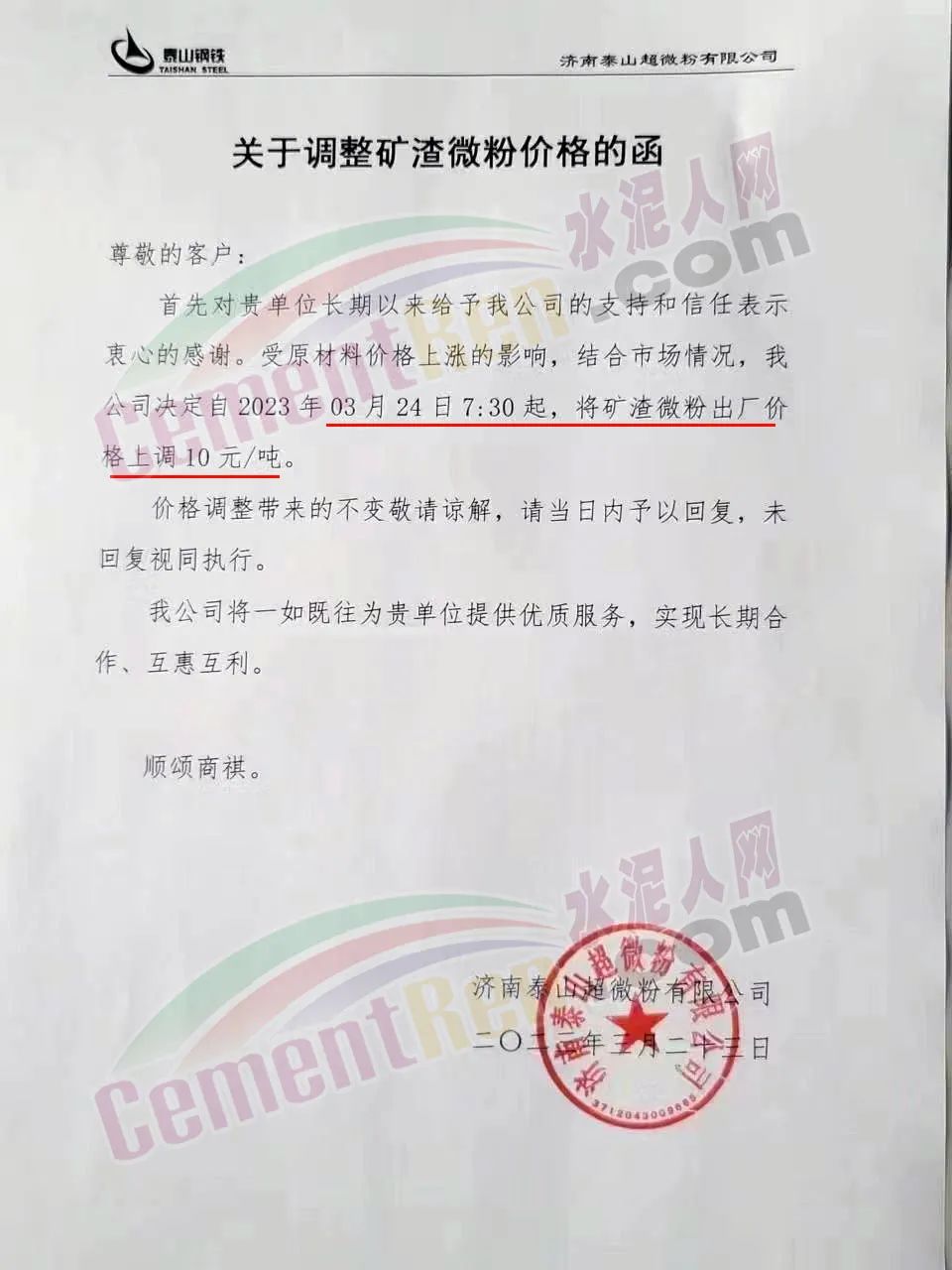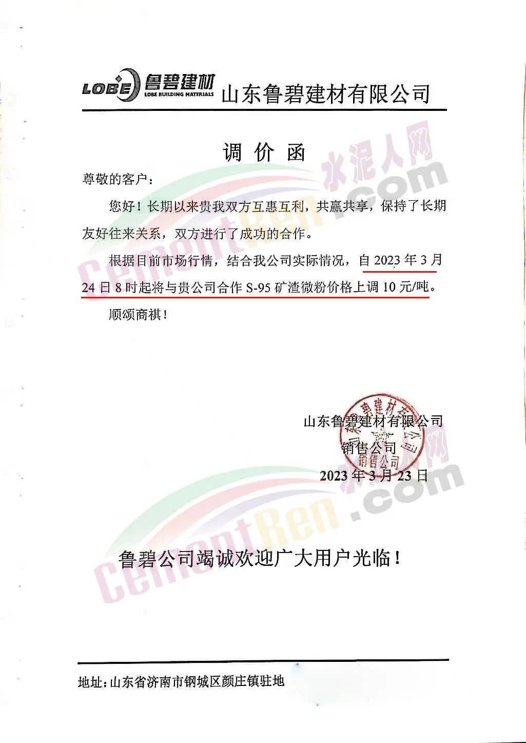 山東魯碧建材有限公司通知自2023年3月24日8時起將與貴公司合作S95礦渣微粉價格上調(diào)10元/噸。