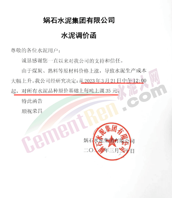 媧石水泥集團(tuán)有限公司通知,由于煤炭、熟料等原材料價格上漲,導(dǎo)致水泥生產(chǎn)成本大幅上升。公司經(jīng)研究決定從2023年3月21日中午12:00起,對所有水泥品種原價基礎(chǔ)上每噸上調(diào)35元。