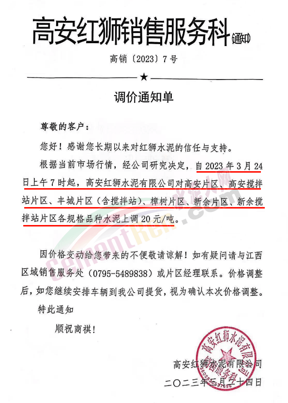 高安紅獅銷售服務(wù)科通知自2023年3月24日上午7時起,對高安片區(qū)、高安攪拌站片區(qū)、豐城片區(qū)(含攪拌站)、樟樹片區(qū)、新余片區(qū)、新余攪拌站片區(qū)各規(guī)格品種水泥上調(diào)20元/噸。