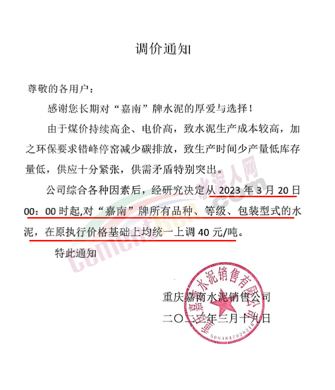 重慶嘉南水泥銷售公司通知,由于煤價持續(xù)高企、電價高,致水泥生產(chǎn)成本較高,加之環(huán)保要求錯峰停窯減少碳排放,致生產(chǎn)時間少產(chǎn)量低庫存量低,供應(yīng)十分緊張,供需矛盾特別突出。公司綜合各種因素后,經(jīng)研究決定從2023年3月20日0時起,對“嘉南”牌所有品種、等級、包裝型式的水泥,在原執(zhí)行價格基礎(chǔ)上均統(tǒng)一上調(diào)40元/噸。