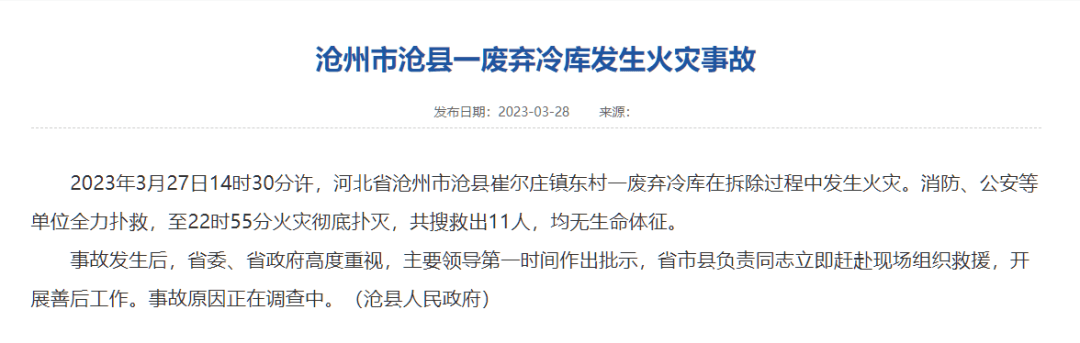 據(jù)河北省滄州市滄縣人民政府官網(wǎng)28日消息, 2023年3月27日14時30分許,河北省滄州市滄縣崔爾莊鎮(zhèn)東村一廢棄冷庫在拆除過程中發(fā)生火災。消防、公安等單位全力撲救,至22時55分火災徹底撲滅,共搜救出11人,均無生命體征。