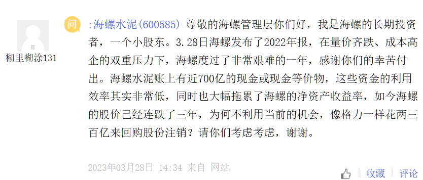 另有一位海螺的長期投資者表示:海螺水泥2022年在量價齊跌、成本高企的雙重壓力下,海螺度過了非常艱難的一年,感謝你們的辛苦付出。海螺水泥賬上有近700億的現(xiàn)金或現(xiàn)金等價物,這些資金的利用效率其實(shí)非常低,同時也大幅拖累了海螺的凈資產(chǎn)收益率,如今海螺的股價已經(jīng)連跌了三年,為何不利用當(dāng)前的機(jī)會,像格力一樣花兩三百億來回購股份注銷?