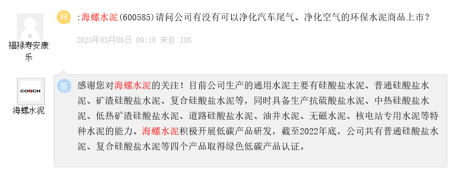 海螺水泥回復(fù):目前公司生產(chǎn)的通用水泥主要有硅酸鹽水泥、普通硅酸鹽水泥、礦渣硅酸鹽水泥、復(fù)合硅酸鹽水泥等,同時具備生產(chǎn)抗硫酸鹽水泥、中熱硅酸鹽水泥、低熱礦渣硅酸鹽水泥、道路硅酸鹽水泥、油井水泥、無磁水泥、核電站專用水泥等特種水泥的能力。海螺水泥積極開展低碳產(chǎn)品研發(fā),截至2022年底,公司共有普通硅酸鹽水泥、復(fù)合硅酸鹽水泥等四個產(chǎn)品取得綠色低碳產(chǎn)品認(rèn)證。