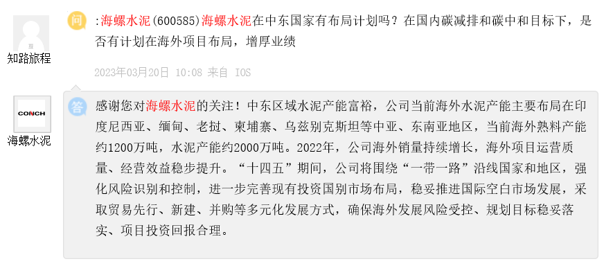 問題七:海螺水泥在中東國家有布局計(jì)劃嗎?在國內(nèi)碳減排和碳中和目標(biāo)下,是否有計(jì)劃在海外項(xiàng)目布局,增厚業(yè)績?
