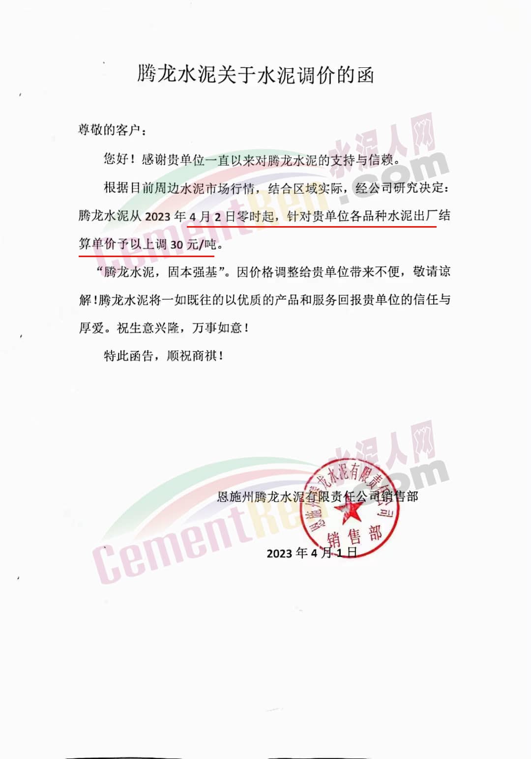 恩施州騰龍水泥有限責(zé)任公司銷售部通知,根據(jù)目前周邊水泥市場(chǎng)行情,結(jié)合區(qū)域?qū)嶋H,經(jīng)公司研究決定騰龍水泥從2023年4月2日零時(shí)起,各品種水泥出廠結(jié)算單價(jià)上調(diào)30元/噸。