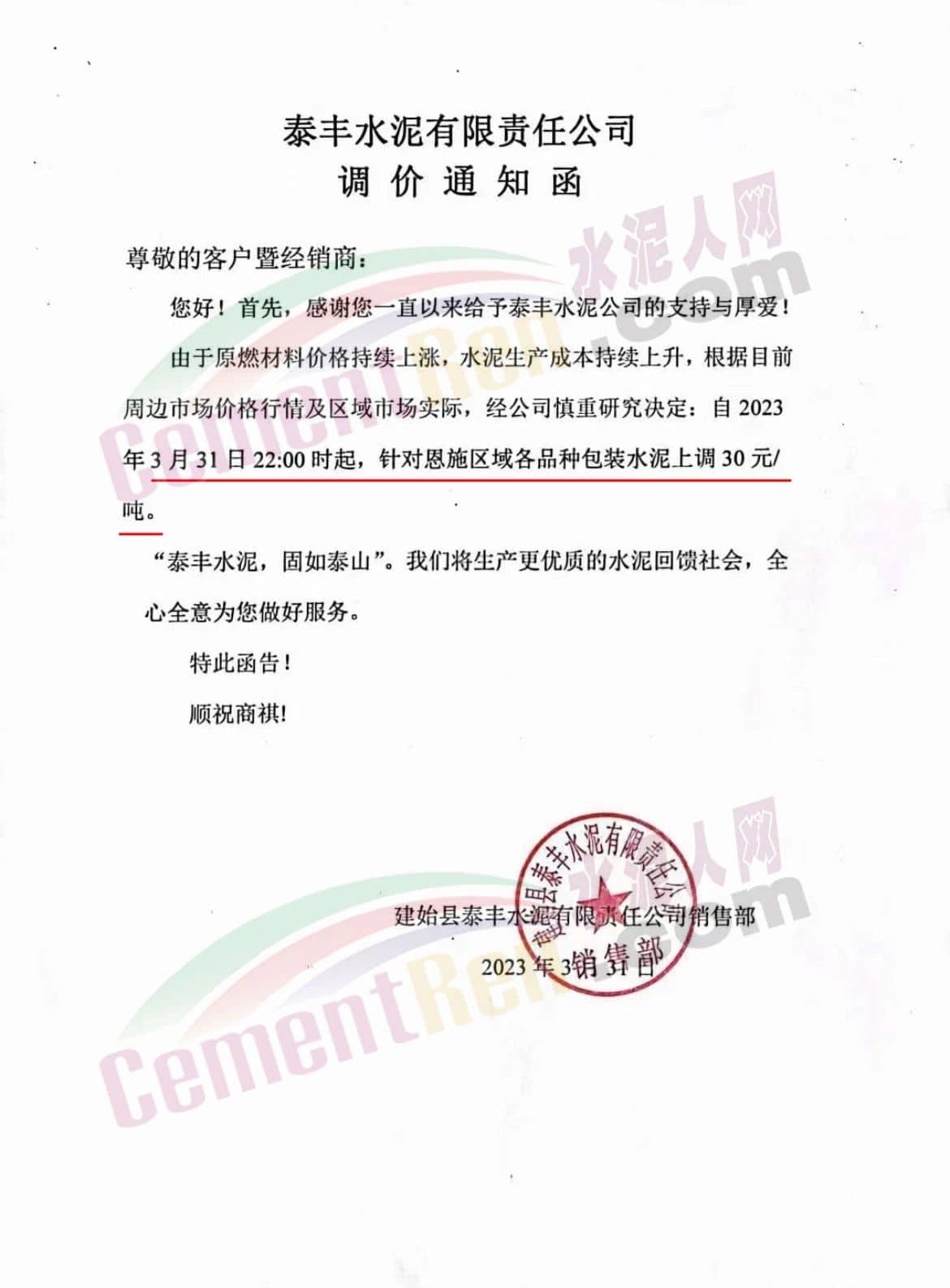 建始縣泰豐水泥有限責(zé)任公司銷售部通知,由于原燃材料價(jià)格持續(xù)上漲,水泥生產(chǎn)成本持續(xù)上升,根據(jù)目前周邊市場(chǎng)價(jià)格行情及區(qū)域市場(chǎng)實(shí)際,經(jīng)公司慎重研究決定,自2023年3月31日22:00時(shí)起,針對(duì)恩施區(qū)域各品種包裝水泥上調(diào)30元/噸。
