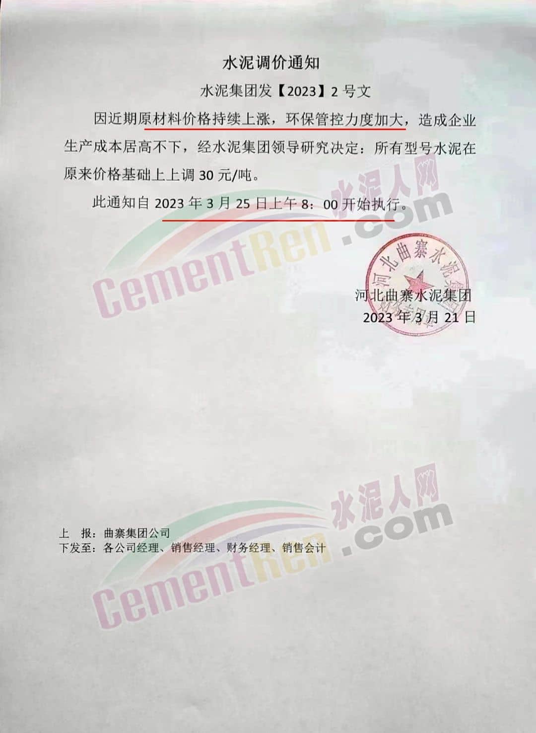 河北曲寨水泥集團(tuán)通知,因近期原材料價(jià)格持續(xù)上漲,環(huán)保管控力度加大,造成企業(yè)生產(chǎn)成本居高不下,經(jīng)水泥集團(tuán)領(lǐng)導(dǎo)研究決定自2023年3月25日上午8時(shí)開始所有型號(hào)水泥在原來(lái)價(jià)格基礎(chǔ)上上調(diào)30元/噸。