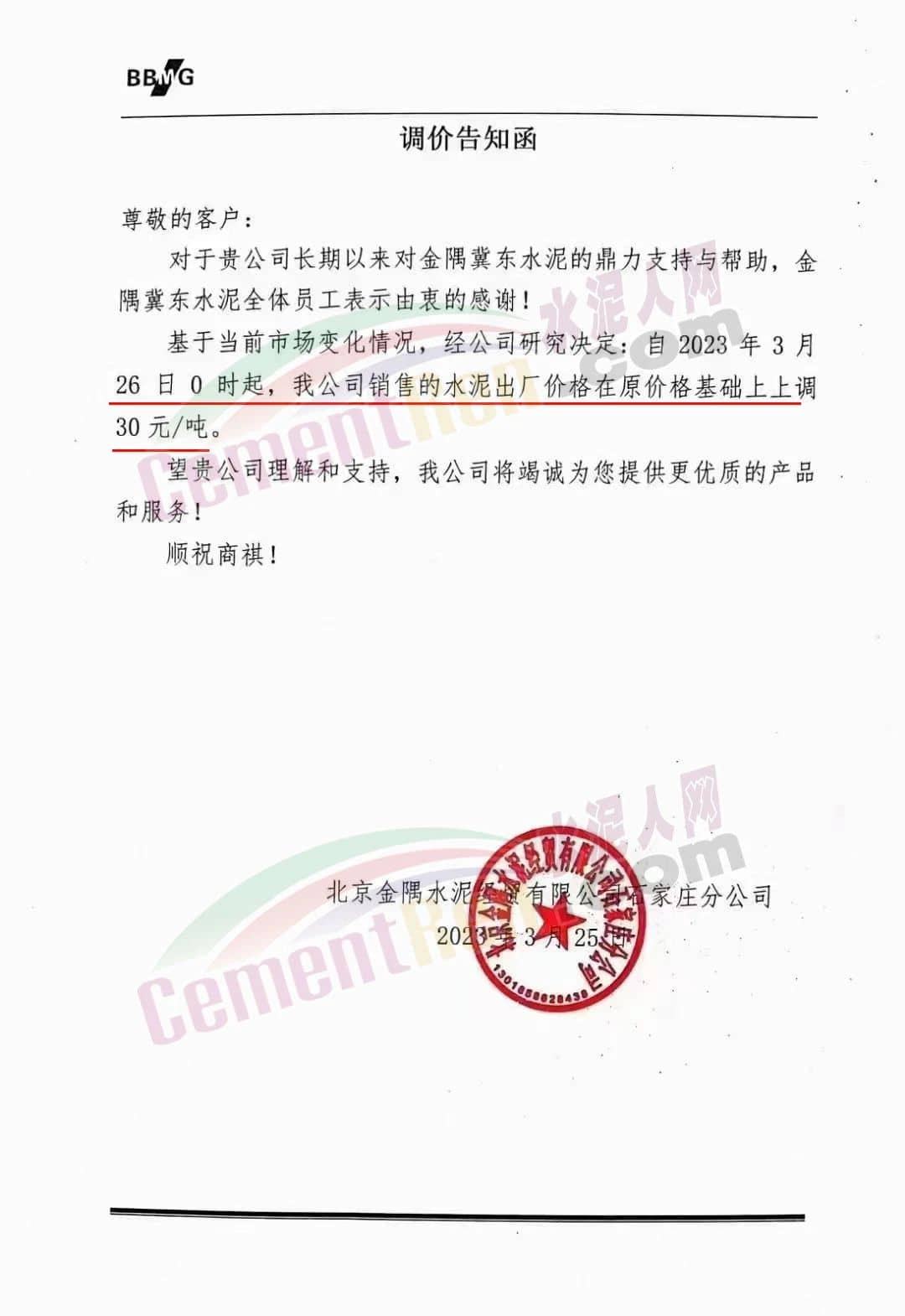 北京金隅水泥有限公司石家莊分公司通知基于當(dāng)前市場(chǎng)變化情況,經(jīng)公司研究決定自2023年3月26日0時(shí)起,公司銷售的水泥出廠價(jià)格在原價(jià)格基礎(chǔ)上上調(diào)30元/噸。