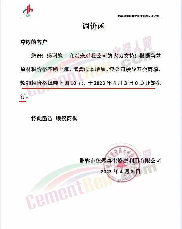 邯鄲市德煜再生資源利用有限公司通知,根據(jù)當(dāng)前原材料價(jià)格不斷上漲,運(yùn)營(yíng)成本增加,經(jīng)公司領(lǐng)導(dǎo)開會(huì)商榷,從2023年4月3日0點(diǎn)開始超細(xì)粉價(jià)格每噸上調(diào)10元。