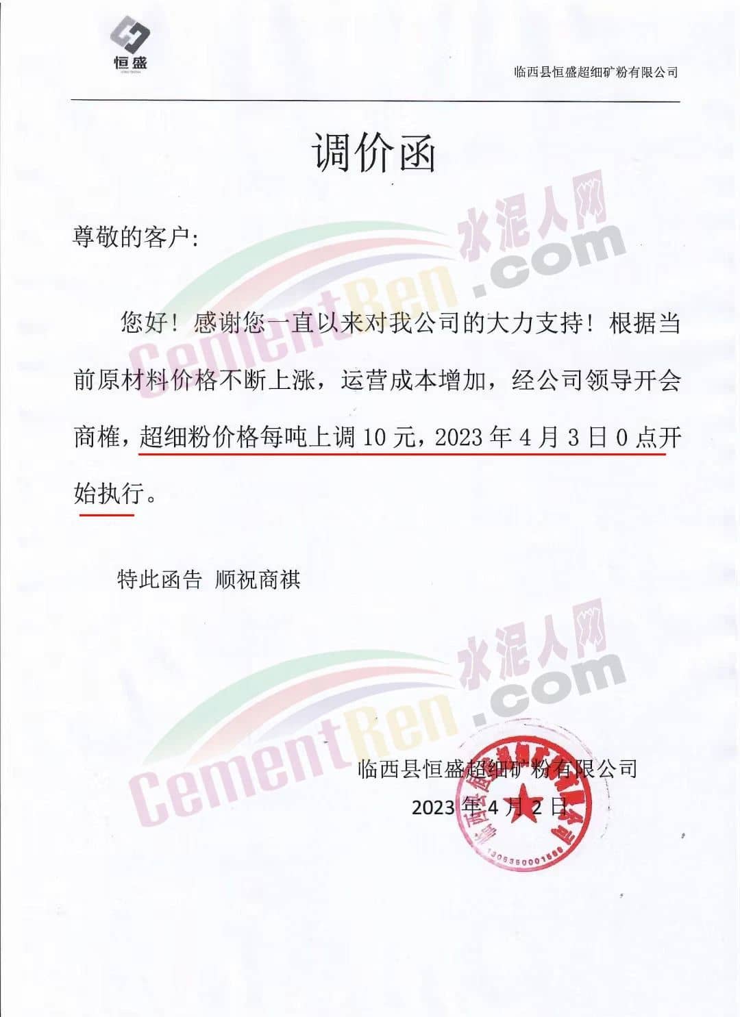 臨西縣恒盛有限公司通知,根據(jù)當(dāng)前原材料價(jià)格不斷上漲,運(yùn)營(yíng)成本增加,經(jīng)公司領(lǐng)導(dǎo)開會(huì)商榷,超細(xì)粉價(jià)格每噸上調(diào)10元,2023年4月3日0點(diǎn)開始執(zhí)行。