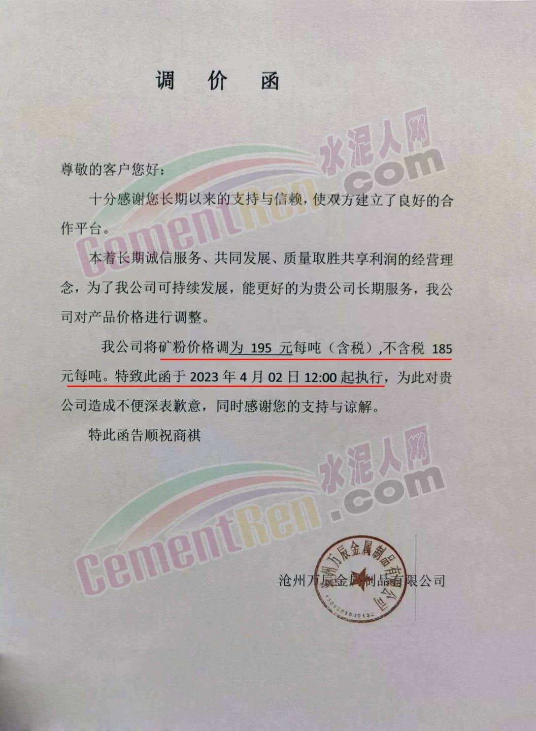 滄州萬(wàn)辰金屬制品著有限公司通知于2023年4月2日12時(shí)起執(zhí)行礦粉價(jià)格調(diào)整為195元每噸(含稅),不含稅185元每噸。