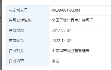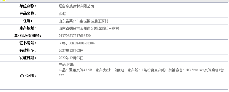 企業(yè)新申請的生產(chǎn)許可證編號為(魯)XK08-001-03304 ,有效期至2022年12月2日。許可范圍為1條粉磨生產(chǎn)線,關鍵設備為Φ3.5m×14m水泥磨機1臺。