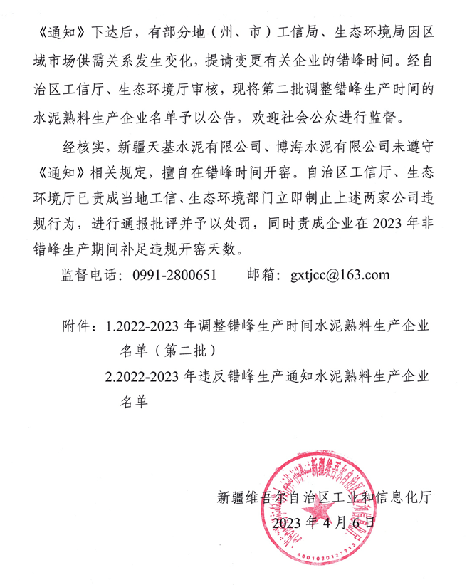 日前,新疆維吾爾自治區(qū)工信廳發(fā)布公告文件公開通報新疆天基水泥有限公司、博海水泥有限公司未遵守《通知》相關(guān)規(guī)定,擅自在錯峰時間開窯。自治區(qū)工信廳、生態(tài)環(huán)境廳已責(zé)成當?shù)毓ば?、生態(tài)環(huán)境部門立即制止上述兩家公司違規(guī)行為,進行通報批評并予以處罰,同時責(zé)成企業(yè)在 2023 年非錯峰生產(chǎn)期間補足違規(guī)開窯天數(shù)。
