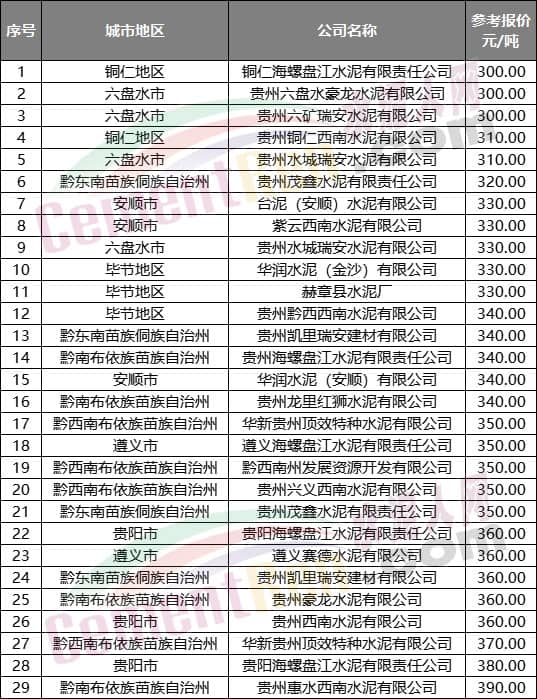 4月中旬前后,水泥人網(wǎng)信息中心重點監(jiān)控的貴州省內(nèi)29家水泥企業(yè)P.O42.5散裝水泥參考報價在300-390元/噸。安順地區(qū)臺泥水泥、華潤水泥、西南水泥報價在330-340元/噸,同區(qū)域企業(yè)之間價格基本持平。