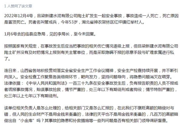 1月中旬,呂梁新建水泥公司一陶土礦發(fā)生冒頂事故,致1人死亡,因涉嫌瞞報(bào)被曝光。