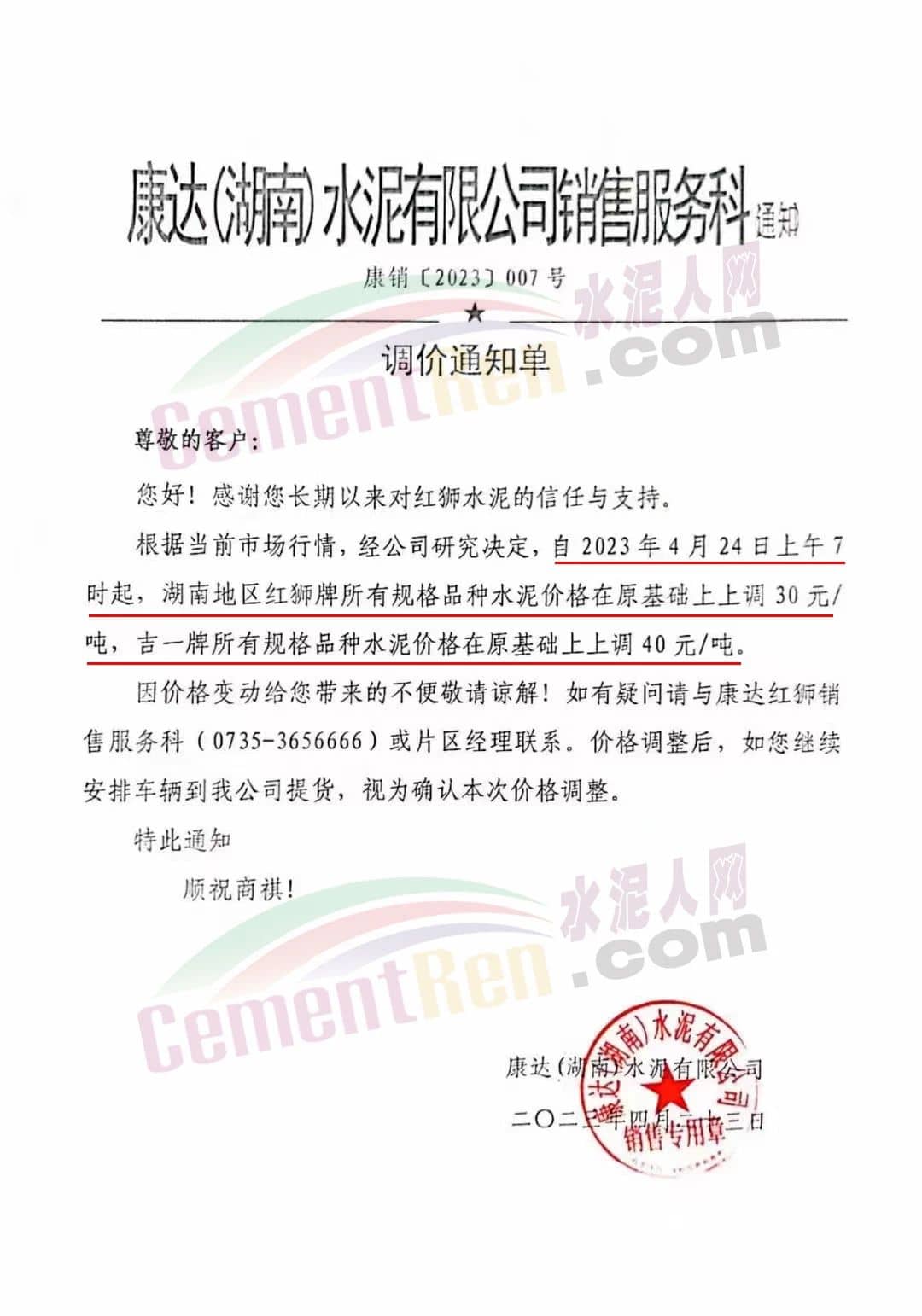 與上述區(qū)域類似,湖南區(qū)域紅獅水泥旗下康達湖水泥有限公司銷售服務科通知稱,根據(jù)當前市場行情,經(jīng)公司研究決定,自2023年4月24日上午7時起,湖南地區(qū)紅獅牌所有規(guī)格品種水泥價格在原基礎上上調(diào)30元/噸,吉一牌所有規(guī)格品種水泥價格在原基礎上上調(diào)40元/噸。