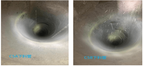 結(jié)合水泥廠工藝實際情況,經(jīng)報集團(tuán)技術(shù)服務(wù)部批準(zhǔn),該水泥廠最終決定采用耐火科技生產(chǎn)研發(fā)的“新型氮化硅微晶下料管”。經(jīng)過為期一年的使用后,雙方對微晶下料管進(jìn)行檢查,結(jié)果發(fā)現(xiàn)下料管壁內(nèi)完好、整體未見明顯結(jié)皮,C5A 下料管錐部轉(zhuǎn)彎處有少許懸掛料,但不大于 1cm,整體效果比較完好,并且未發(fā)生因 C5 下料管結(jié)皮堵塞導(dǎo)致的停窯事故,保證了窯系統(tǒng)的安全運行,檢查結(jié)果如下圖。