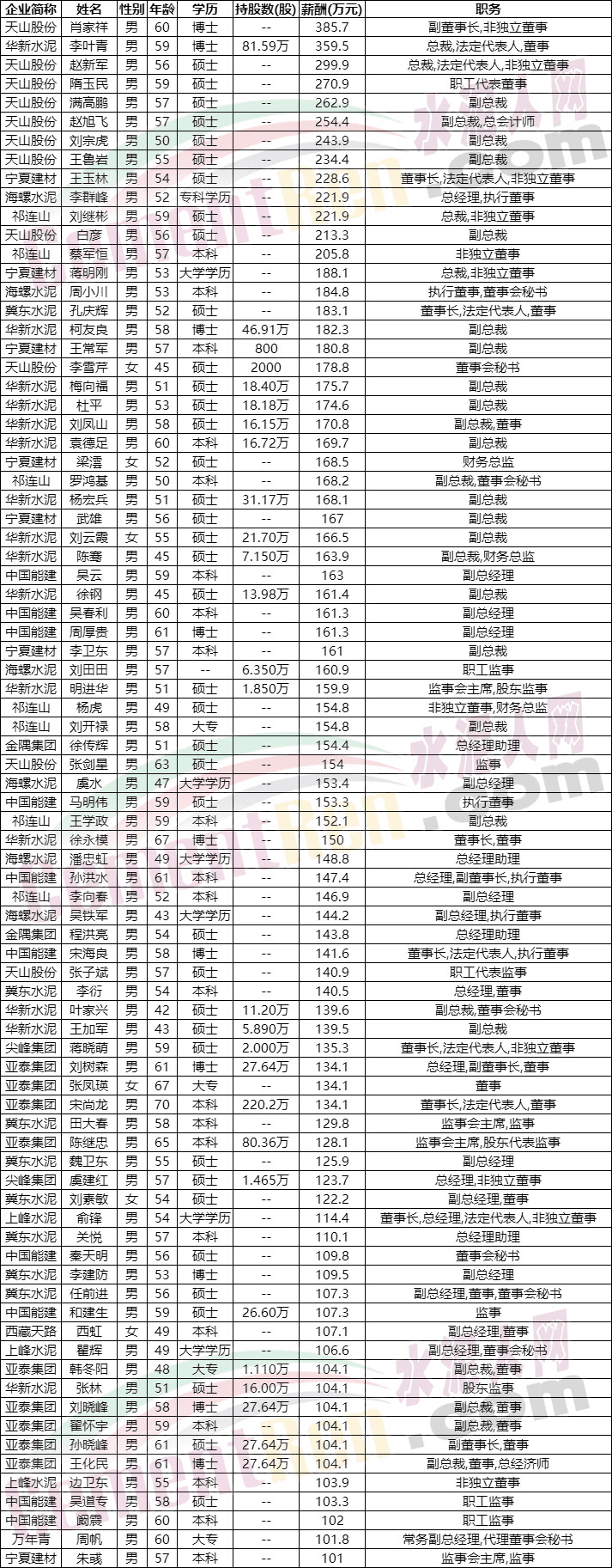 從上市公司已公布數(shù)據(jù)可見,薪酬在200萬以上的高管中,除李葉青持有企業(yè)股份外,包括海螺水泥總經(jīng)理李群峰、寧夏建材董事長(zhǎng)王玉林以及祁連山水泥總裁劉繼彬,非獨(dú)立董事蔡軍恒以及天山股份的多位高管均未持有公司股份。