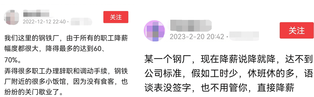 “某一鋼廠,現(xiàn)在降薪說降就降,達不到公司標準,假如工時少,休班休的多……直接降薪”。