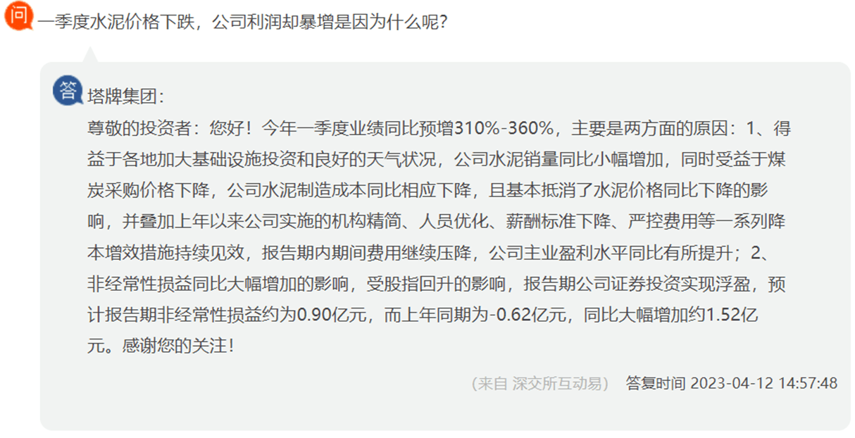此前塔牌水泥在回復投資者提問時表示,自上年以來公司實施的機構精簡、人員優(yōu)化、薪酬標準下降、嚴控費用等一系列降本增效措施持續(xù)見效,今年一季度期間費用繼續(xù)壓降,公司主業(yè)盈利水平同比有所提升。