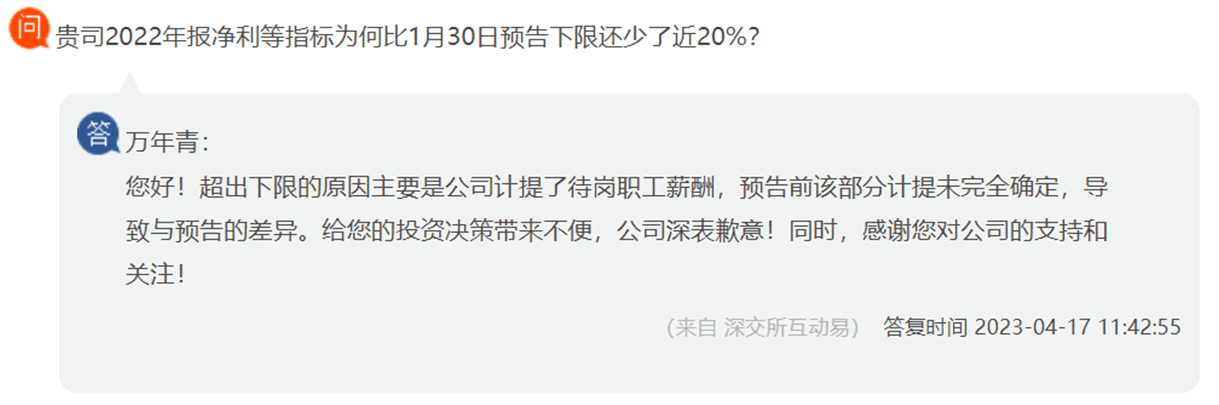 萬年青水泥上市公司在向投資者解釋為什么企業(yè)2022年凈利潤等指標比1月30日預告下限還少了近20%時表示,超出下限的原因主要是公司計提了待崗職工薪酬,預告前該部分計提未完全確定,導致與預告的差異。