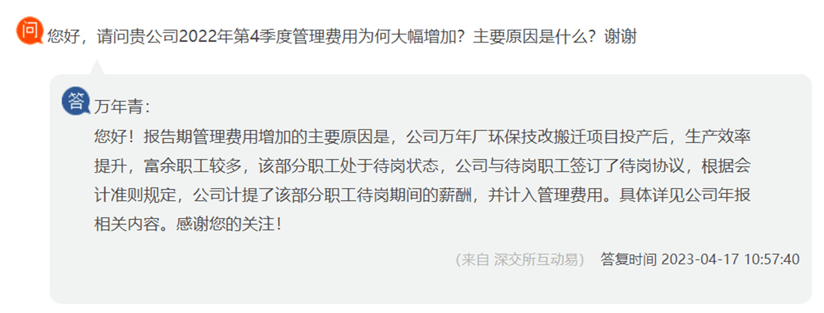 并提及2022年管理費用增加的主要原因是,公司萬年廠環(huán)保技改搬遷項目投產后,生產效率提升,富余職工較多,該部分職工處于待崗狀態(tài),公司與待崗職工簽訂了待崗協(xié)議,根據會計準則規(guī)定,公司計提了該部分職工待崗期間的薪酬,并計入管理費用。