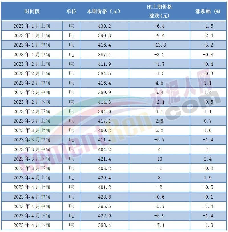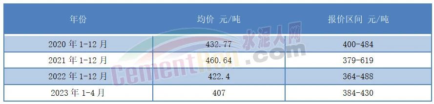 從水泥價(jià)格方面來(lái)看,2023年在煤炭?jī)r(jià)格大幅上漲的背景下,2023年1-4月流通領(lǐng)域P.O42.5散裝水泥均價(jià)為407元/噸,各時(shí)間段報(bào)價(jià)在384-430元/噸之間波動(dòng),且多個(gè)時(shí)間段水泥價(jià)格在400元/噸以下。