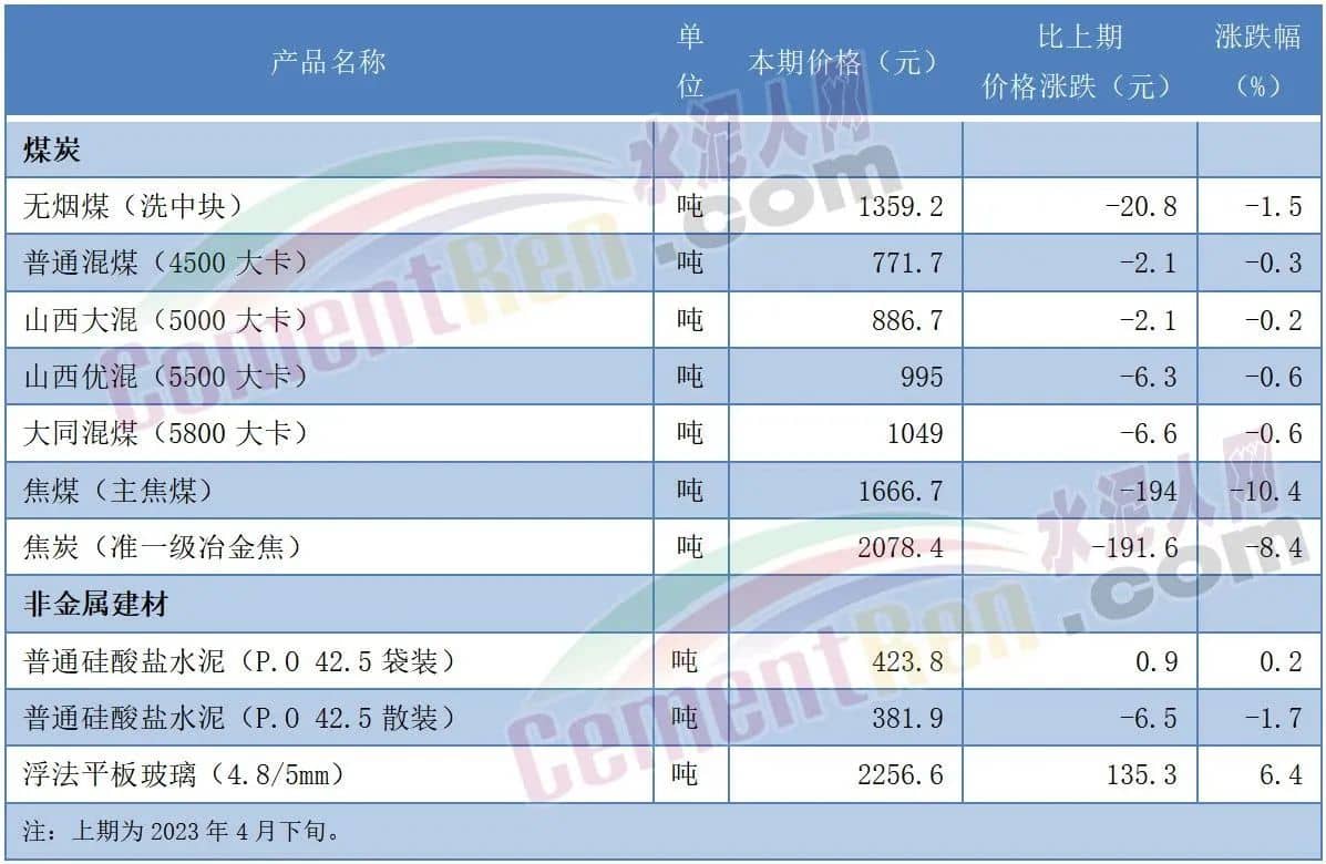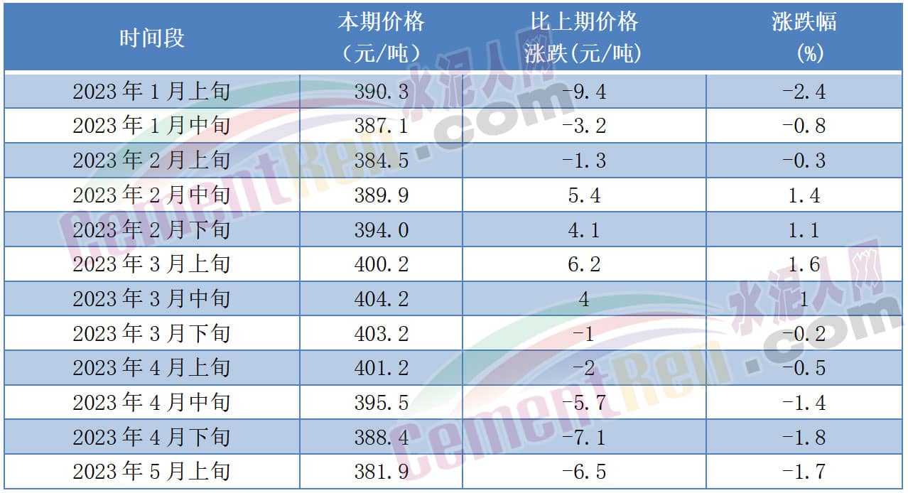 國家統(tǒng)計局最新發(fā)布的全國流通領域9大類50種重要生產(chǎn)資料市場價格顯示,2023年5月上旬與4月下旬相比,8種產(chǎn)品價格上漲,42種下降。其中,普通硅酸鹽水泥(P.O 42.5散裝)價格為381.9元/噸,較4月下旬下跌6.5元/噸,跌幅1.7%,為今年初至今的最低點了。
