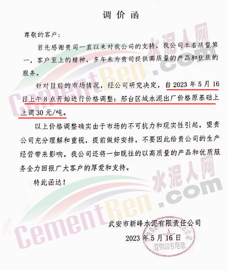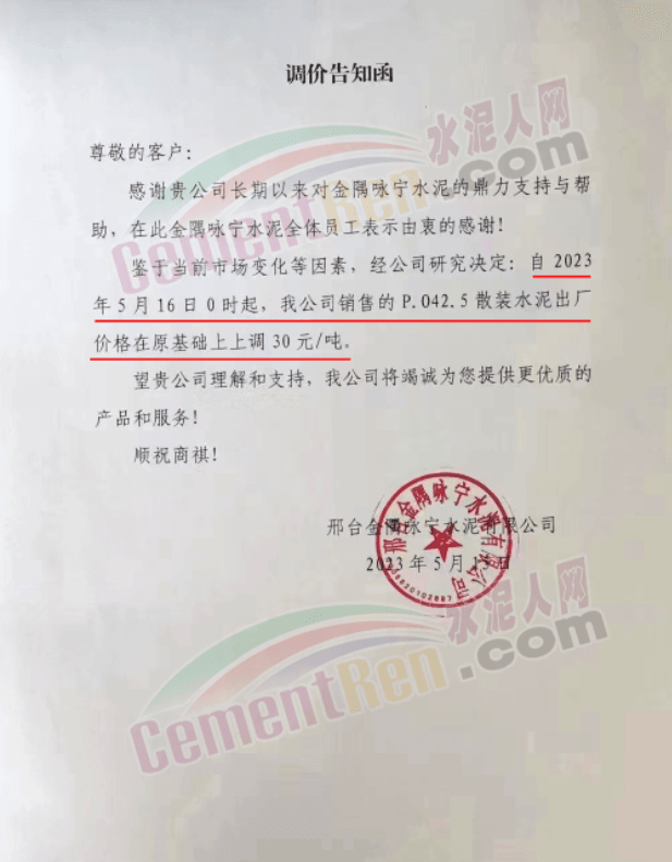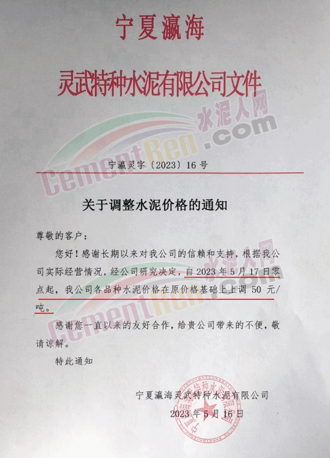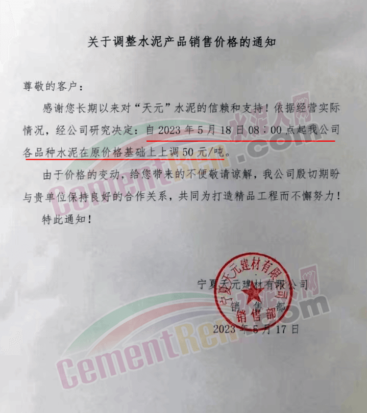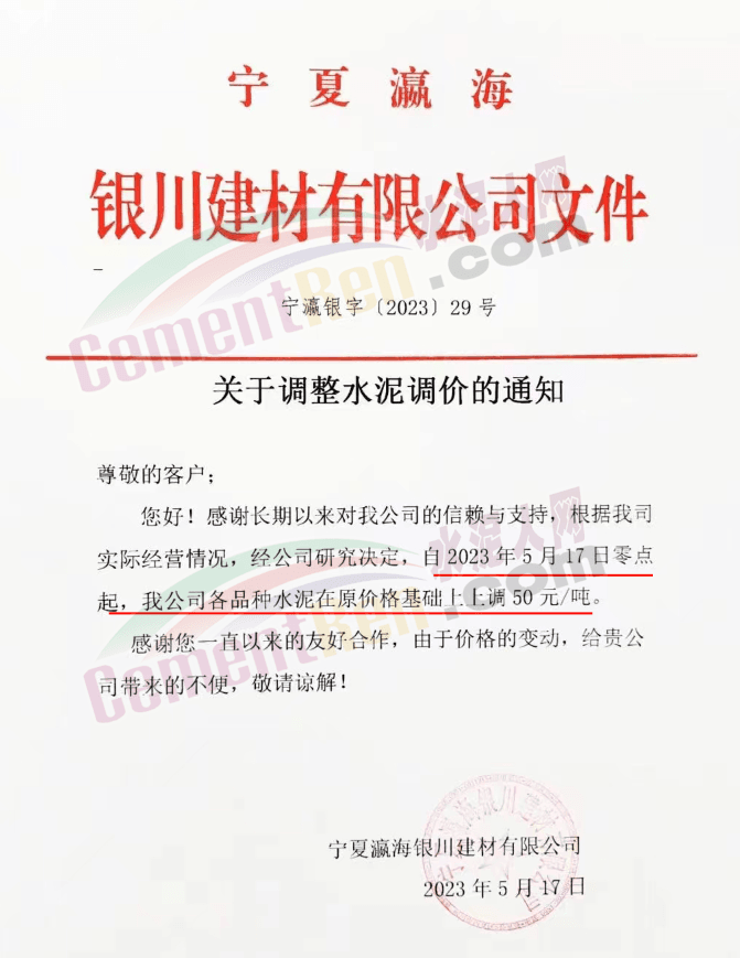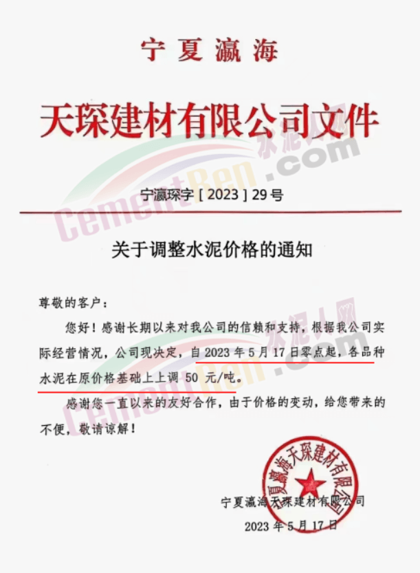 寧夏瀛海天琛建材有限公司通知,根據(jù)公司實際經(jīng)營情況,現(xiàn)決定,自2023年5月17日零點起,各品種水泥在原價格基礎上上調(diào)50元/噸。