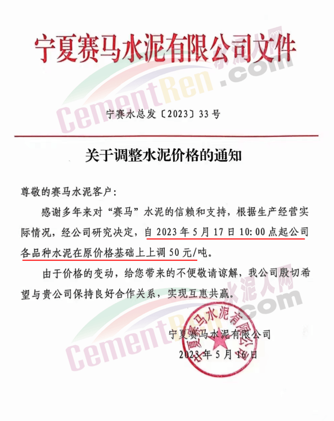寧夏賽馬水泥有限公司通知,根據(jù)生產(chǎn)經(jīng)營實際情況,經(jīng)公司研究決定,自2023年5月17日10時起公司各品種水泥在原價格基礎上上調(diào)50元/噸。