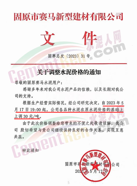 固原市賽馬新型建材有限公司通知根據(jù)生產(chǎn)經(jīng)營實際情況,經(jīng)公司研究決定,自5月17日19時起,公司各品種水泥在原水泥價格的基礎上上調(diào)30元/噸。