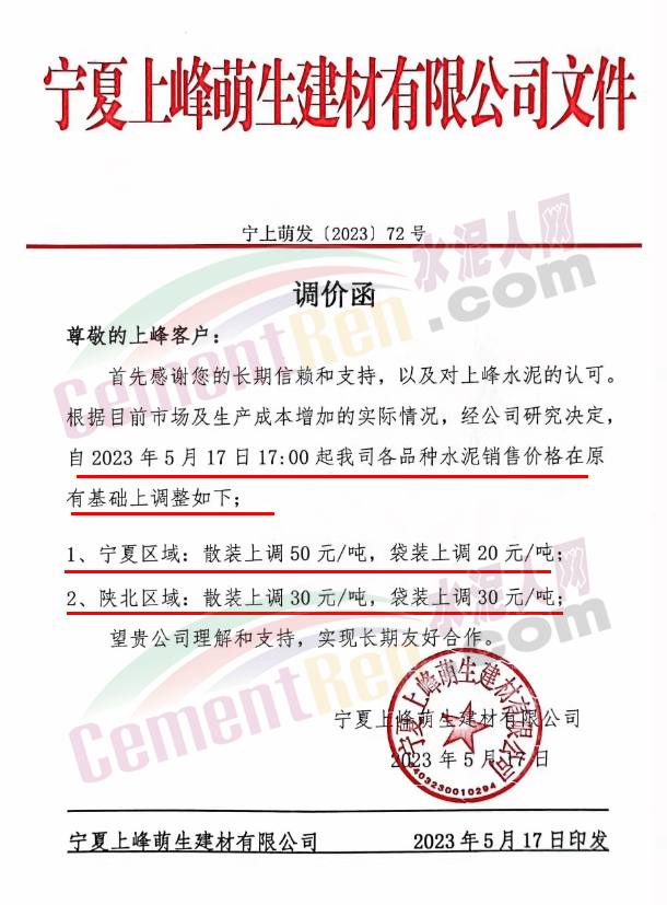 寧夏上峰萌生建材有限公司通知根據(jù)目前市場及生產(chǎn)成本增加的實際情況,經(jīng)公司研究決定自5月17日17時起公司各品種水泥銷售價格在原有基礎上調(diào)整。其中寧夏區(qū)域:散裝上調(diào)50元/噸,袋裝上調(diào)20元/噸;陜北區(qū)域:散裝上調(diào)30元/噸,袋裝上調(diào)30元/噸。