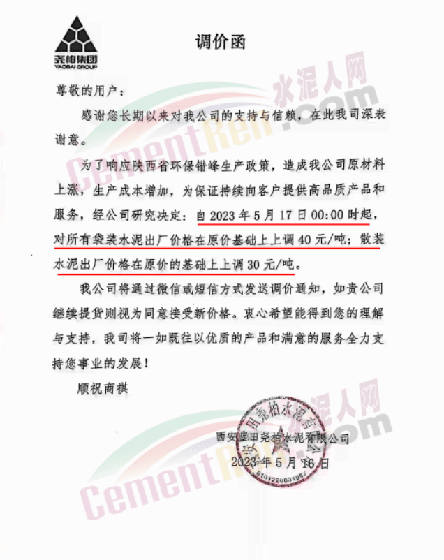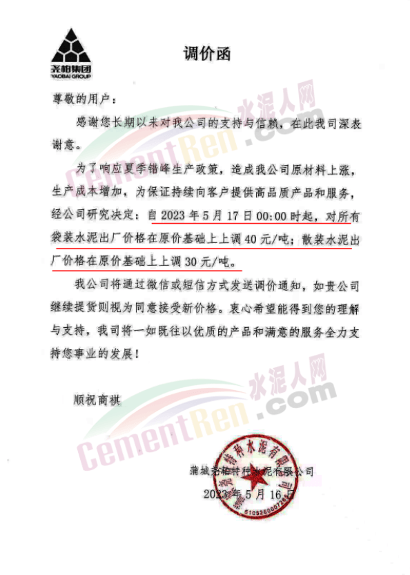 同日,蒲城堯柏特種水泥有限公司通知,為了響應夏季錯峰生產(chǎn)政策,造成公司原材料上漲,生產(chǎn)成本增加,為保證持續(xù)向客戶提供高品質(zhì)產(chǎn)品和服務。經(jīng)公司研究決定:自5月17日0時起,對所有袋裝水泥出廠價格在原價基礎上上調(diào)40元/噸;散裝水泥出廠價格在原價基礎上上調(diào)30元/噸。