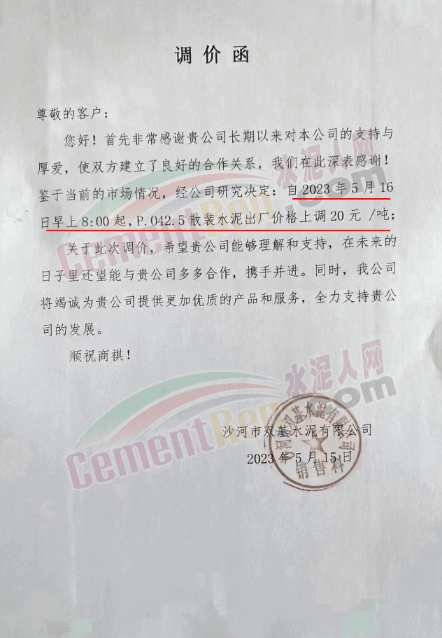 沙河雙基水泥有限公司通知,自5月16日早8時起,P.O42.5散裝水泥出廠價格上調(diào)20元/噸。