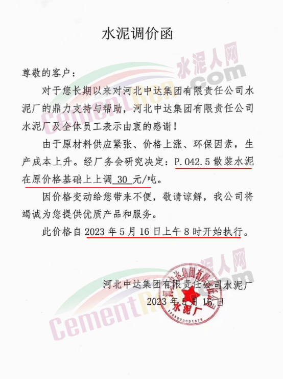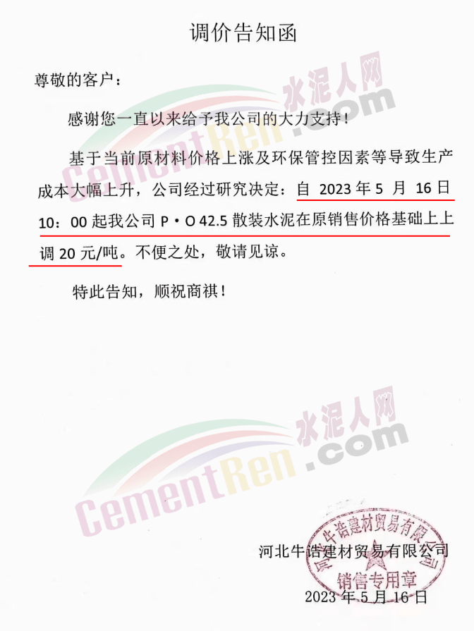 河北牛誥建材貿(mào)易有限公司通知,基于當前原材料價格上漲及環(huán)保管控因素等導致生產(chǎn)成本大幅上升,公司經(jīng)過研究決定:自5月16日10時起,P.O42.5散裝水泥上調(diào)20元/噸。