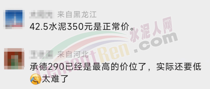 來自黑龍江的網(wǎng)友表示,42.5水泥350元/噸是正常價;來自河北的網(wǎng)友表示,承德P.O42.5水泥290元/噸是最高的價位了,實際還要低。