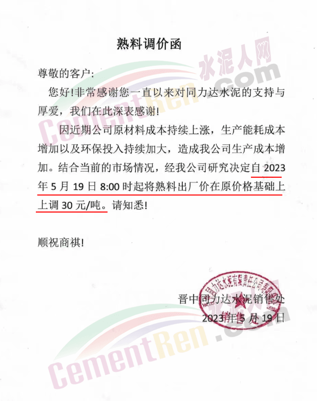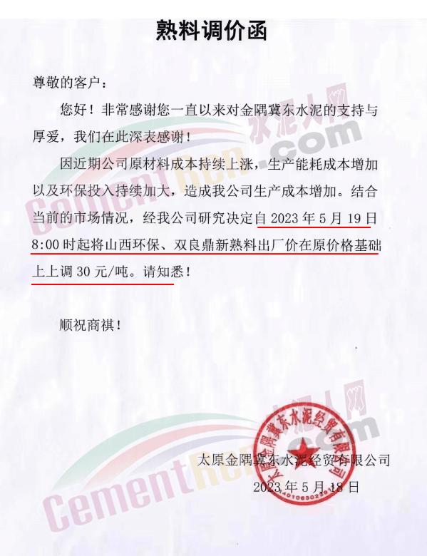 晉中同力達水泥銷售處通知,因近期公司原材料成本持續(xù)上漲,生產(chǎn)能耗成本增加以及環(huán)保投入持續(xù)加大,造成公司生產(chǎn)成本增加。結(jié)合當(dāng)前的市場情況,經(jīng)公司研究決定自5月19日8時起將熟料出廠價在原價格基礎(chǔ)上上調(diào)30元/噸。