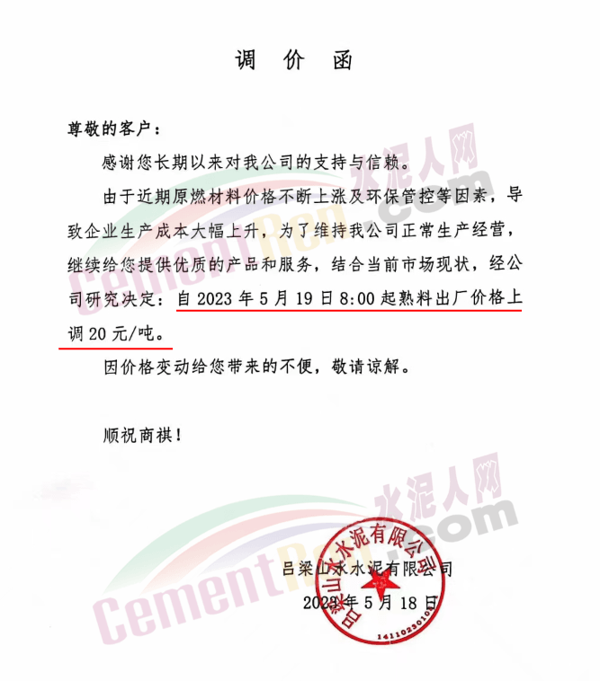呂梁山水水泥有限公司通知,由于近期原燃材料價格不斷上漲及環(huán)保管控等因素,導(dǎo)致企業(yè)生產(chǎn)成本大幅上升,為了維持公司正常生產(chǎn)經(jīng)營繼續(xù)給客戶提供優(yōu)質(zhì)的產(chǎn)品和服務(wù),結(jié)合當(dāng)前市場現(xiàn)狀,經(jīng)公司研究決定,自5月19日8時起熟料出廠價格上調(diào)20元/噸。