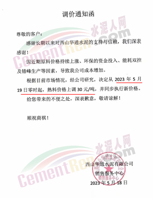 西山華通水泥有限公司通知因近期原料價格持續(xù)上漲、環(huán)保的資金投入、能耗雙控及錯峰生產(chǎn)等因素,導(dǎo)致公司成本增加。根據(jù)目前市場情況,經(jīng)公司研究,決定從年5月19日零時起熟料價格上調(diào)30元/噸。
