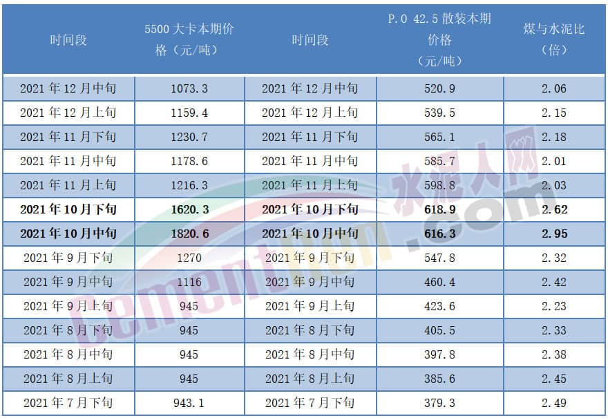 國(guó)家統(tǒng)計(jì)局公布的數(shù)據(jù)顯示,2021年10月中下旬5500大卡煤炭報(bào)價(jià)1600元/噸以上的時(shí)候,水泥價(jià)格也漲至當(dāng)年最高點(diǎn)610元/噸以上。且自7月下旬到12月中旬,煤價(jià)一直是水泥價(jià)格的兩倍多。
