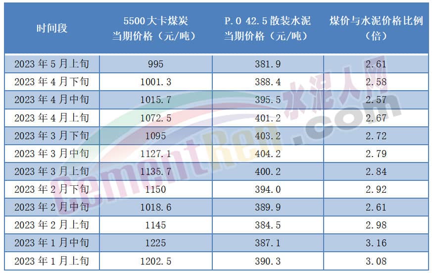 今年1月上旬~5月上旬,5500大卡煤炭與P.O42.5散裝水泥價(jià)格比例也多在2倍多。也就是說(shuō)煤價(jià)調(diào)整的同時(shí)水泥價(jià)格也在調(diào)整,其比例一直較穩(wěn)定。今年煤價(jià)微降,水泥價(jià)格跌至近五年新低,水泥跌價(jià)與煤炭跌價(jià)出現(xiàn)脫鉤跡象,水泥下跌幅度明顯比煤炭幅度要大。