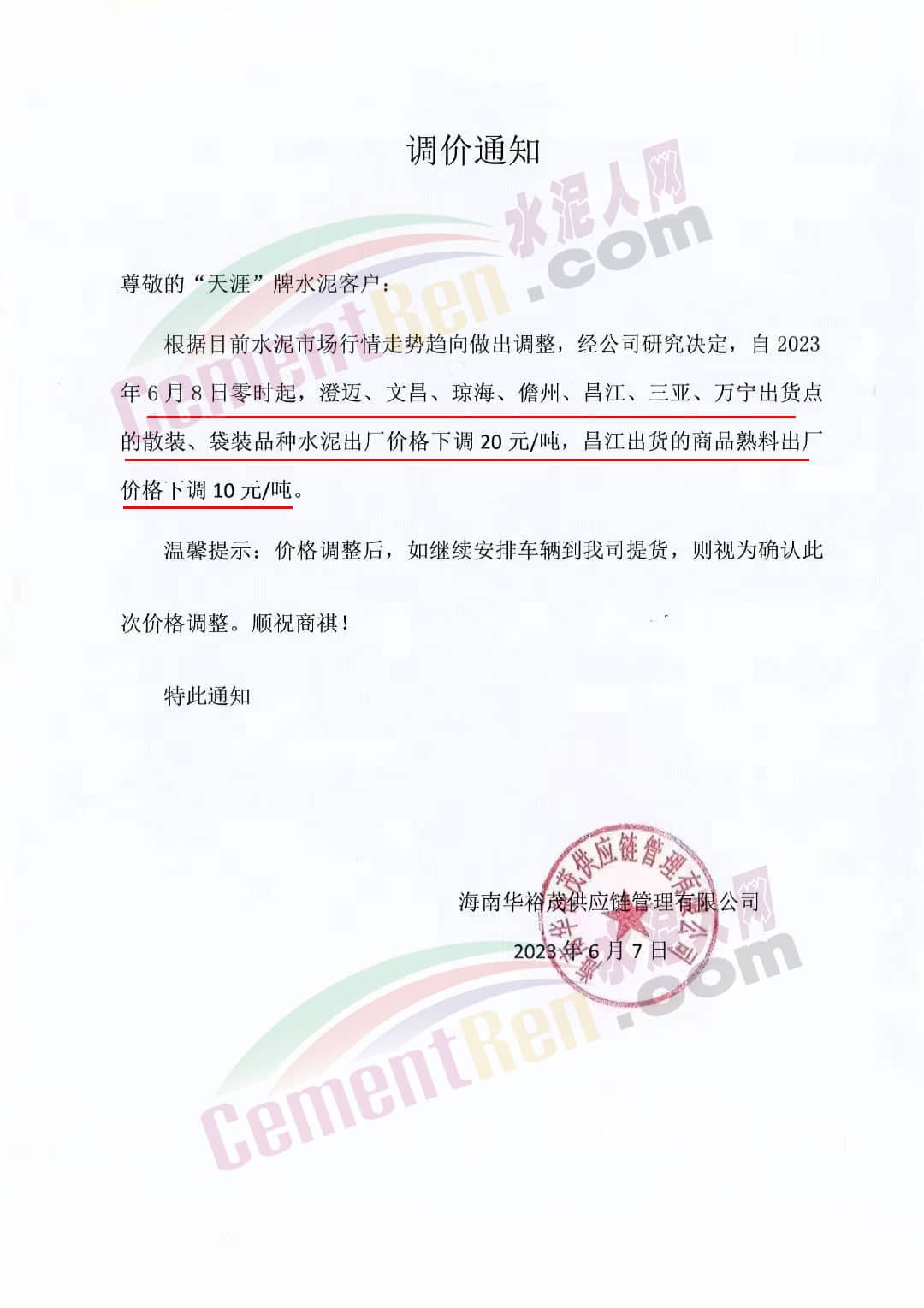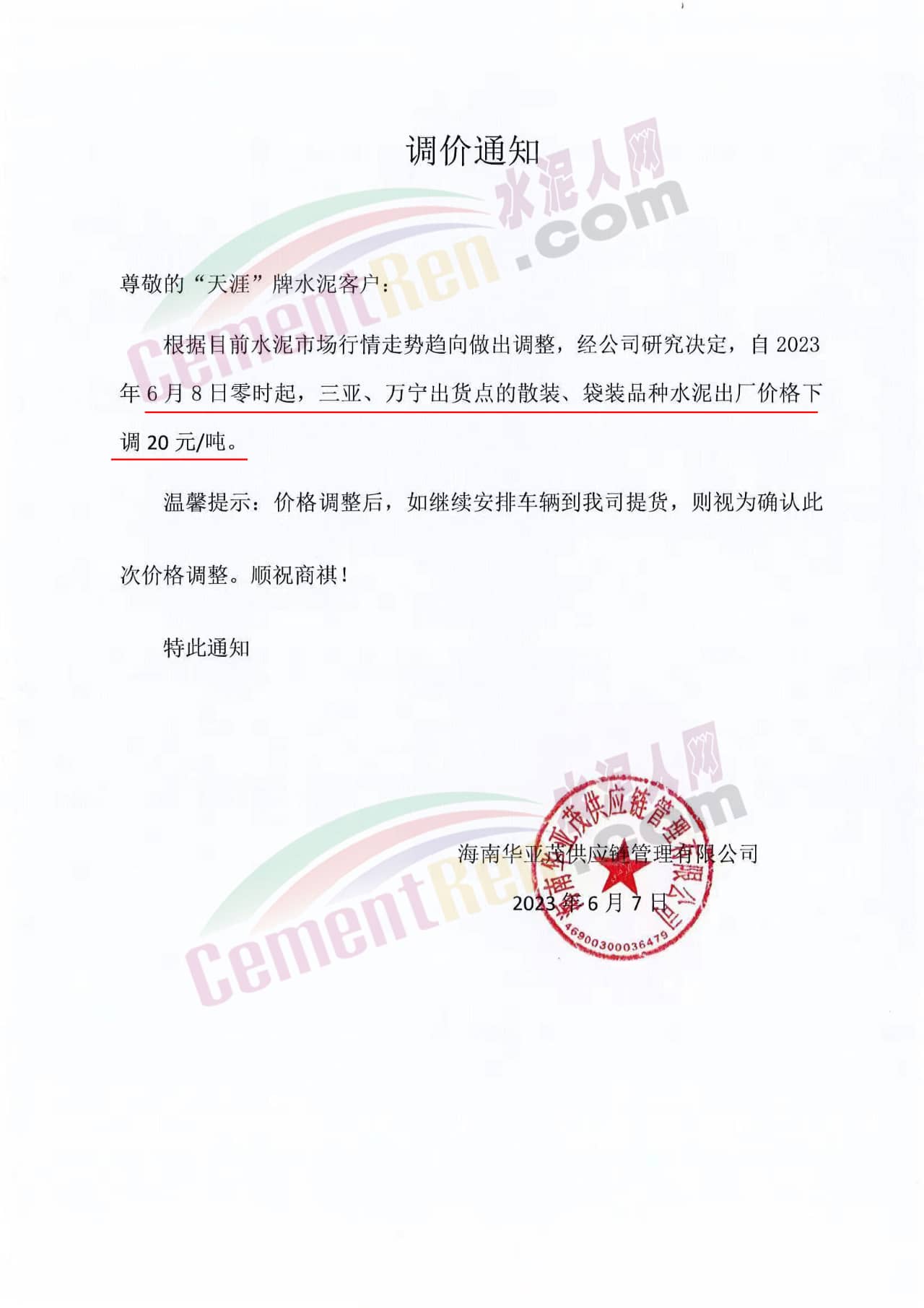 海南華亞茂供應(yīng)鏈管理有限公司通知根據(jù)目前水泥市場行情走勢趨向做出調(diào)整。經(jīng)公司研究決定,自2023年6月8日零時(shí)起,三亞、萬寧出貨點(diǎn)的散裝、袋裝品種水泥出廠價(jià)格下調(diào)20元/噸。