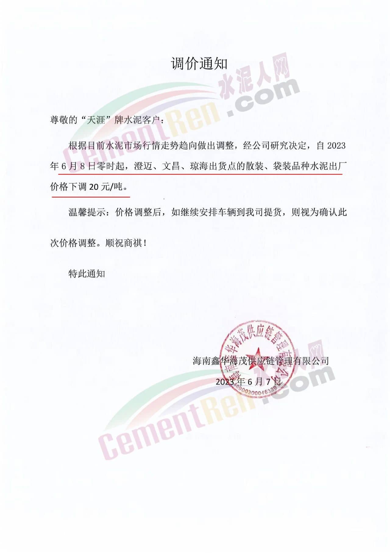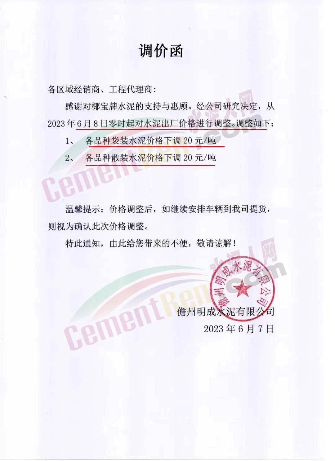 同期儋州明成水泥有限公司發(fā)函通知從2023年6月8日零時(shí)起對“椰寶”牌水泥出廠價(jià)下調(diào)20元/噸。