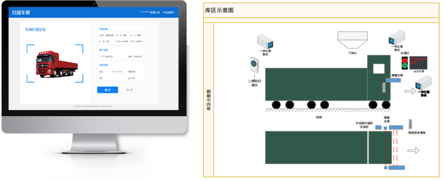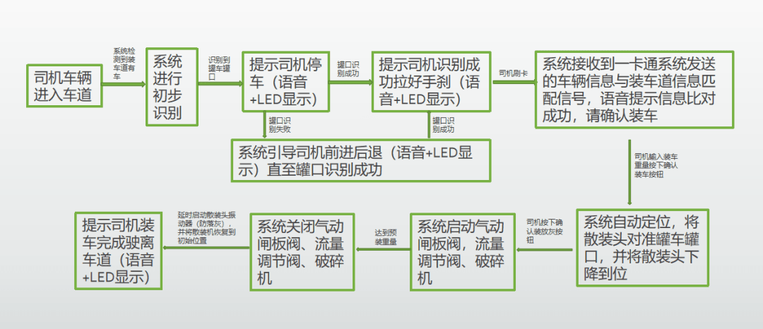 司機刷碼上磅時,控制系統(tǒng)會根據(jù)庫下面的光幕、紅外傳感器等設(shè)備檢測到車輛停的位置,并通過LED顯示屏及語音自動提示車輛停到指定的位置。當(dāng)車輛到達(dá)指定位置,司機準(zhǔn)備好可以裝車,系統(tǒng)自動測量車輛長度、高度,測量車廂長度、高度,獲取輪軸數(shù)據(jù)(車輛荷載噸位數(shù))、車牌信息,記錄完成,卸料口開始裝車,當(dāng)物料達(dá)到車廂高度時移動小車帶動皮帶機及散裝機水平移動裝車,直至裝滿整個車廂。如果未能停到指定位置,LED及語音進(jìn)行反復(fù)提示并在設(shè)定的時間后通知管理人員。