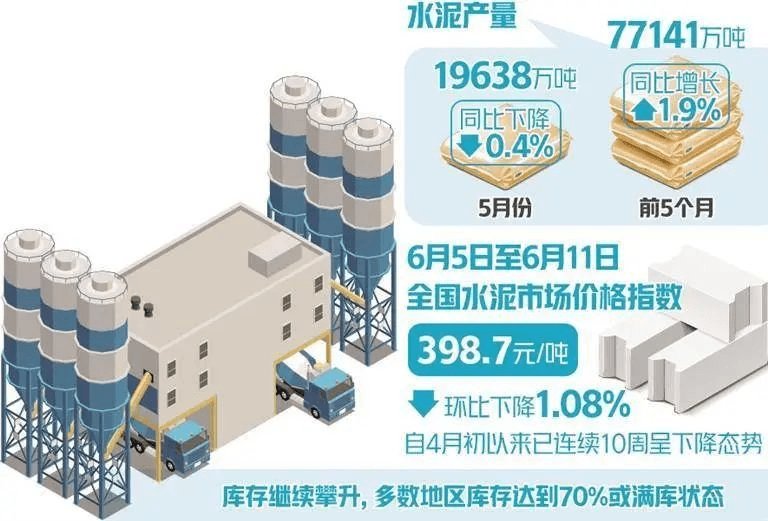 進(jìn)入6月以來,受降雨、工程項(xiàng)目資金緊張等因素影響,水泥成交量大幅下滑,各企業(yè)庫存壓力增大。全國水泥庫容比達(dá)75.81%,部分區(qū)域企業(yè)庫存達(dá)到100%。