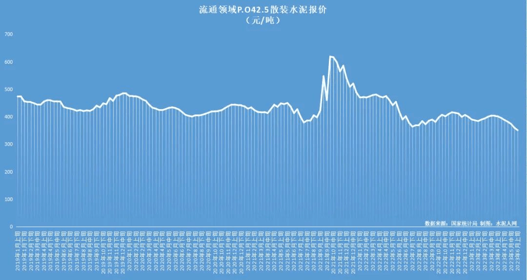 圖:流通領(lǐng)域P.O42.5散裝水泥自2023年5月下旬創(chuàng)造近5年市場(chǎng)最低價(jià)以后,6月上旬再破最低價(jià)紀(jì)錄。