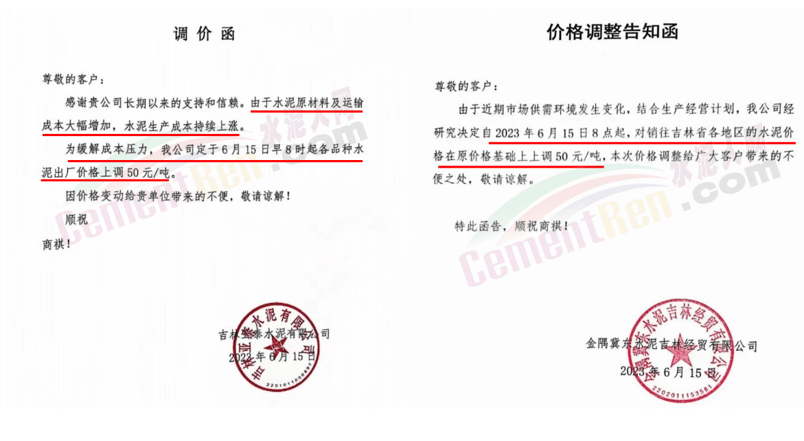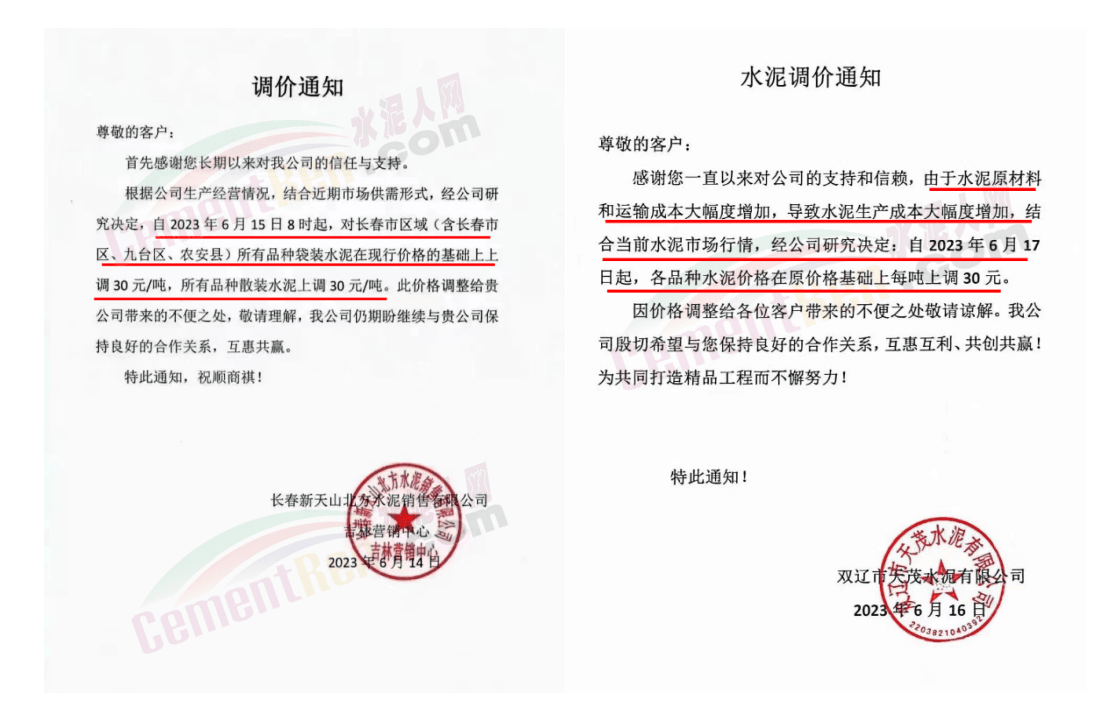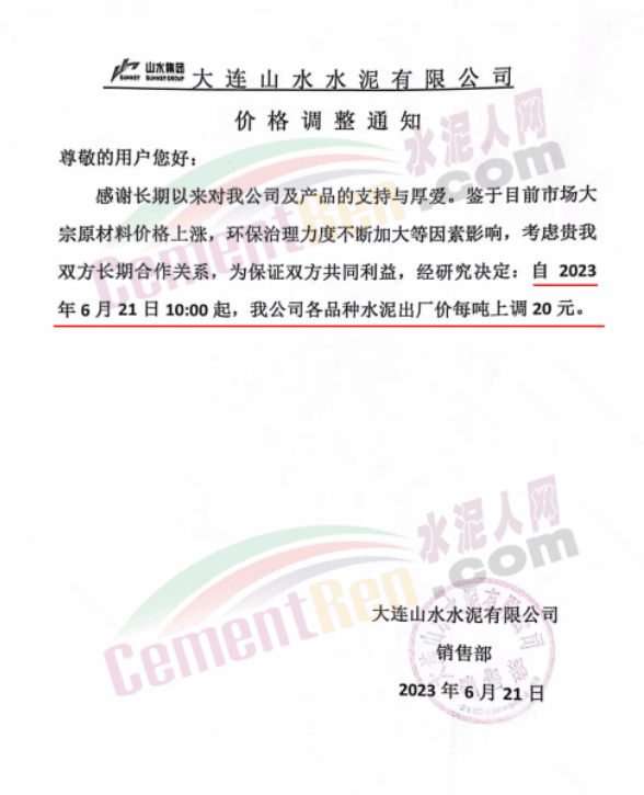 大連山水水泥有限公司價(jià)格調(diào)整通知稱,鑒于目前市場(chǎng)大宗原材料價(jià)格上漲,環(huán)保治理力度不斷加大等因素影響,經(jīng)研究決定,自 2023年6月21日10時(shí)起,公司各品種水泥出廠價(jià)每噸上調(diào)20元。