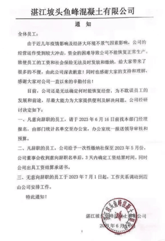 日前,廣東湛江坡頭魚峰混凝土有限公司發(fā)通知給員工稱,由于近幾年疫情影響及經(jīng)濟大環(huán)境不景氣因素影響,公司的經(jīng)營運作受到較大沖擊,資金的困難導(dǎo)致公司不能恢復(fù)正常生產(chǎn),致使員工的工資和社會保險無法及時發(fā)放和繳納。目前,公司無法確定何時能恢復(fù)經(jīng)營,為不耽誤員工的發(fā)展和前途,為員工提供了離職與調(diào)動方案。