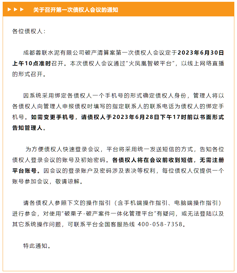 6月21日,雙流法院微發(fā)布微信公眾號發(fā)布《成都蓉聯(lián)水泥有限公司破產(chǎn)清算案第一次債權(quán)人會議通知及操作指引》提到,成都蓉聯(lián)水泥有限公司破產(chǎn)清算案第一次債權(quán)人會議定于2023年6月30日上午10點準(zhǔn)時召開。